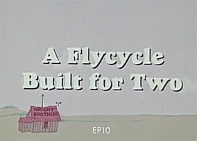 The New Three Stooges: S1E10-A Flycycle Built For Two* (1965) | S1E10-A Flycycle Built For Two: Moe, Larry and Curly Joe perform one experiment after another to create a flying bicycle; and race to be the first ones to make a flying machine when they hear the Wright Brothers are attempting to fly an airplane. | |